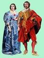 Мужчина одет в расшитый облегающий колет с завышенной линией талии и удлиненными полами. Горловина колета обработана стойкой, которую скрывает батистовый, украшенный кружевом "вандейковский" отложной воротник. Спереди колет застегнут на множество пуговиц от ворота до талии. Рукава имеют по переднему шву продольный разрез, сквозь который видны широкие рукава 6aтистовой сорочки. Удлиненные штаны кончаются под коленом. По внешнему шву штанины украшены воздушными петлями из тесьмы и пуговицами. Па ногax - шелковые чулки и туфли с низким каблуком и oткрытыми боками. Длинный плащ обернут вокруг туловища.